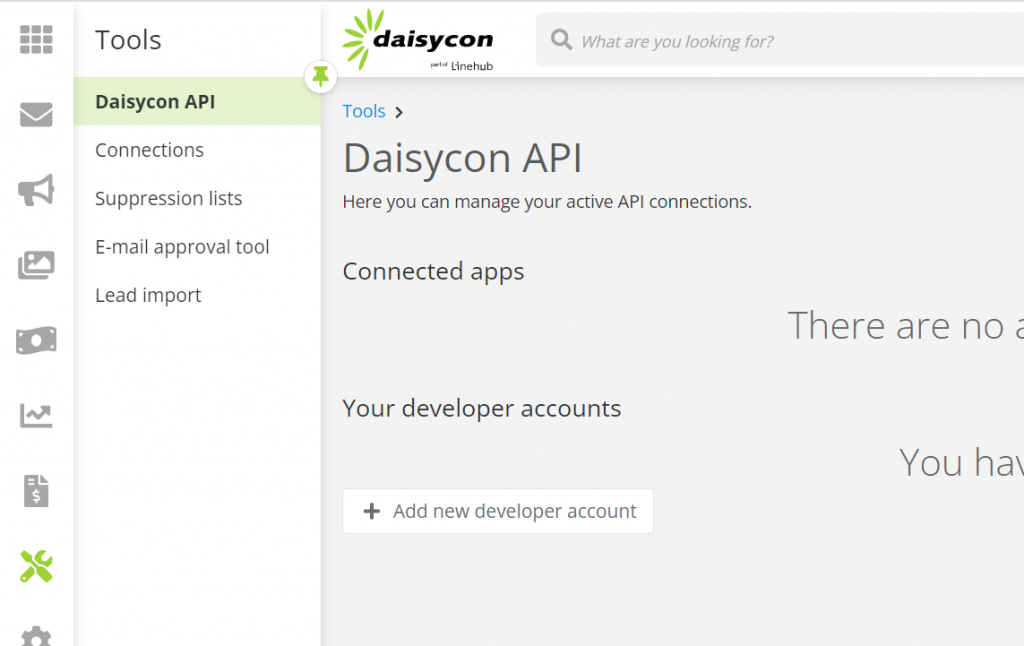 To create a developer account log into the Daisycon system using your Publisher or Advertiser account. Then visit the menu item “Tools -> Daisycon API”